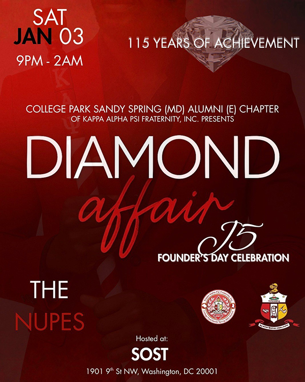 The College Park–Sandy Spring (MD) Alumni Chapter of Kappa Alpha Psi Fraternity, Inc., invites you to the Diamond Affair, a J5 Founders Day Celebration.